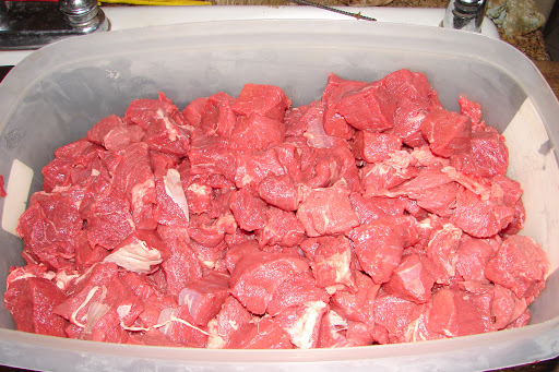 TRIM ROAST OF EXCESSIVE FAT, CUBE INTO 2 INCH CUBES