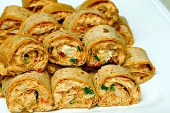 Spread a thin layer of the filling mixture over a tortilla, leaving a small border clear around the edge. Roll the tortilla up tightly into a spiral. Place the rolled up tortilla on a cutting board and use a sharp knife to cut into 1- to 1½-inch thick segments. Transfer to a serving platter and serve chilled or at room temperature.
