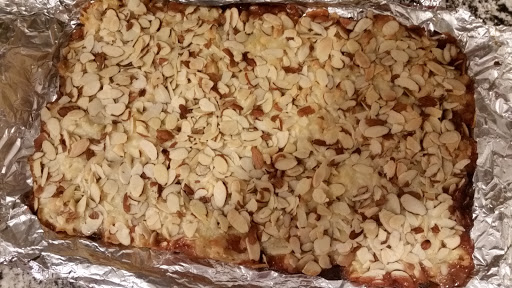 4. Melt 1 cup preserves in a small saucepan over low heat, stirring often. Spread evenly over partially baked blondie in the pan. Stir together coconut, remaining 1 cup white chocolate morsels and remaining half of the batter. Spread over melted preserves, spreading to the edge of the pan. Sprinkle batter with1 cup sliced almonds.