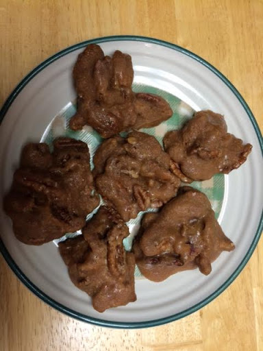 In a large mixing bowl, combine sugar and cream, stirring well. Microwave on high for 14 minutes, stirring after 7 minutes. Add butter, stir, then add pecans. Microwave on high 1 to 2 minutes. (I use 1 1/2 minutes) Drop by tablespoon onto wax paper.(Use second spoon to push off on to paper. Do NOT beat mixture after it reaches hard boil stage.