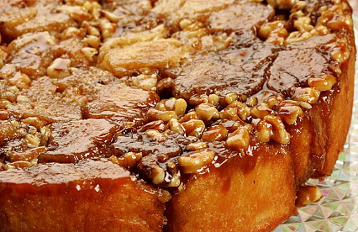 7. Unwrap the risen dough and pour over the remaining butter-brown sugar mixture. Place the pan in the oven and bake until the monkey bread is puffed and golden brown, about 35 to 45 minutes. Cool the monkey bread, still in the pan, on a rack for 15 minutes. Invert the monkey bread onto a serving plate or platter and allow the bread to cool slightly. Serve warm.