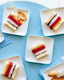 2.Spread raspberry sorbet over ice cream layer. Freeze until firm, about 2 hours. Spread peach sorbet over raspberry layer; top with remaining angel food cake. Wrap in plastic wrap; freeze overnight.