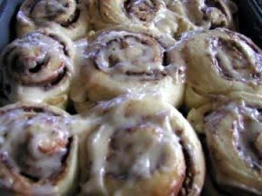 Add all the ingredients, except the Cinnamon Filling and the Butter Frosting, in the bread pan of bread machine. Process according to manufacturer's instructions for a dough setting. NOTE: During the dough setting in the bread machine, there is a rise cycle that will rise the dough. When the bread machine has completed the dough cycle, remove dough from pan and turn out onto a lightly oiled surface. (I use a nonstick cooking spray). Form dough into an oval, cover with a plastic wrap and let rest for 10 minutes.