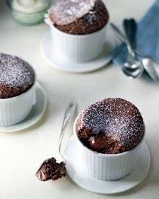 Fill ramekins evenly with batter. Bake on a baking sheet, rotating halfway through, until souffles rise but centers are still liquid, about 14 minutes. Dust with confectioners’ sugar.