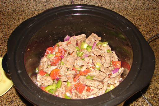 1. Sprinkle strips of sirloin with garlic powder to taste. In a large skillet over medium heat, heat the vegetable oil and brown the seasoned beef strips. Transfer to a slow cooker.