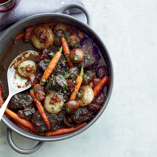 Preheat the oven to 350°. In a large enameled cast-iron casserole, melt the butter in 1 tablespoon of the olive oil. Arrange the meat in the casserole in a single layer and season with salt and pepper. Cook over moderately high heat, turning occasionally, until browned on all sides, 8 minutes. Add the chopped onion and garlic and cook over moderate heat, stirring occasionally, until the onion is softened, 5 minutes. Add the flour and stir to coat the meat with it. Add the wine, bay leaves and thyme, season with salt and pepper and bring to a boil, stirring to dissolve any brown bits stuck to the bottom of the pot.