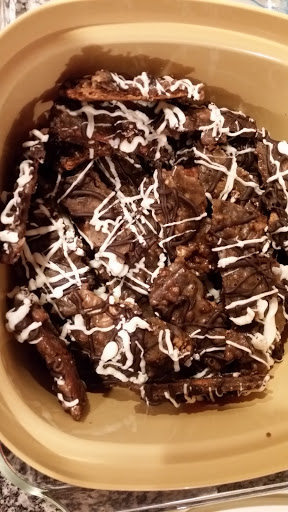 3. Bake 350F for 10 mins. Quickly remove graham crackers to waxed paper, using a spatula and let cool completely. Microwave chocolate chips on high for 30 seconds. Stir and microwave 30 more seconds. Drizzle over cooled crackers and repeat with white chocolate.