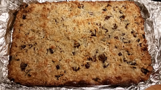 3. In a bowl, mix together the crushed wafers and melted butter until well blended. Press mixture evenly in the bottom of the prepared pan. Over the crust sprinkle white chips, Craisins, nuts and coconut.