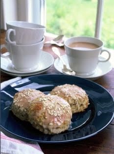In the bowl of an electric mixer fitted with a paddle attachment, combine the flours, oats, baking powder, sugar, and salt. Blend the cold butter in at the lowest speed and mix until the butter is in pea-sized pieces. Combine the buttermilk, maple syrup, and eggs and add quickly to the flour-and-butter mixture. Mix until just blended. The dough may be sticky.
