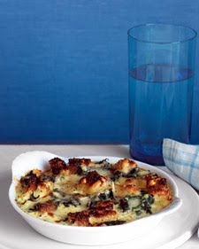 Preheat oven to 400 degrees. In a large skillet, heat oil over medium-high. Add spinach and cook, stirring constantly, until wilted, about 2 minutes. Transfer to a colander and drain, pressing with a rubber spatula to release as much liquid as possible. Divide bread and spinach among four small, shallow 8-ounce baking dishes.