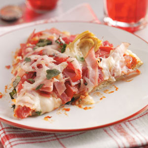 Place crust on an ungreased pizza pan. Spread sauce over crust; sprinkle with 1 cup cheese. Top with red peppers, artichokes, salami and ham; sprinkle with remaining cheese.