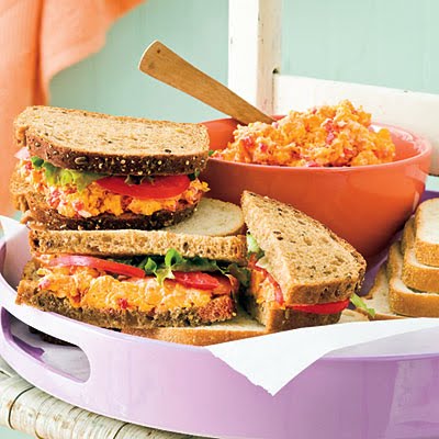 Spread homemade Bacon Pimiento Cheese on whole wheat bread with lettuce and tomato. Use leftover spread on crackers or celery for a snack.