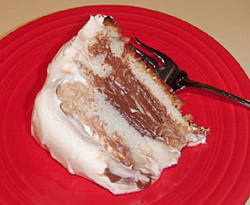 Using a serrated knife, cut the center out of the cake to make a well, leaving about 1/2 inch border. Be careful that you don't remove so much of the cake that you make any holes. (You will be adding filling to the center).