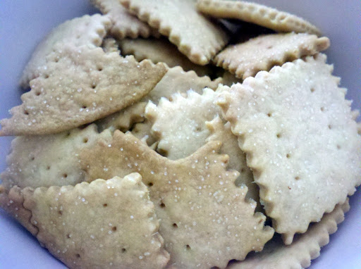 Roll dough out onto a baking or pizza stone. Cut into "cracker" size with a pizza cutter, ravioli cutter or a sharp knife.