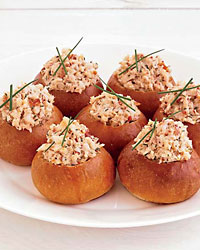 Using a paring knife, cut a 1 1/2-inch-round plug out of the top of each roll, leaving a 1/2-inch border all around. Using a small spoon, carefully hollow out the rolls. Spoon the lobster filling into the rolls, garnish with the chives and serve.