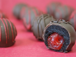 4. Roll mixture into medium sized balls, create an indent with your thumb and press a (dry) cherry into the center. Form the cake mixture around the cherry.