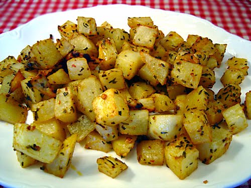 Lightly wipe or spray a baking pan with vegetable oil. Place the potatoes in a single layer on the pan and bake for 30 minutes, until the potatoes are soft and brown.