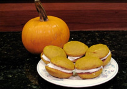 Heat oven to 350 F. Grease two large cookie sheets and set aside. In a large bowl with mixer at low speed beat eggs, sugar & pumpkin until mixed. Mix in oil. Gradually beat in remaining dry ingredients. Drop by rounded tablespoons onto cookie sheets. Bake about 10-12 minutes or until top springs back when lightly touched with finger. Remove to wire racks to cool. When cool, use filling and two cakes to make sandwiches. Makes about 22.