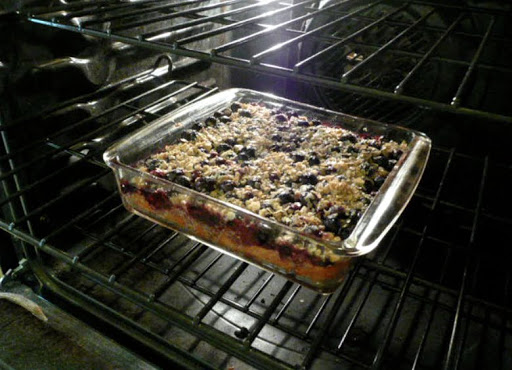 Combine blueberries and sugar in a bowl and toss to coat. Spoon over oats and biscuits and sprinkle with remaining 1/2 cup oats. Drizzle remaining melted butter on top. Bake for 20 minutes or until cake is golden brown and center is done. Cool for 20 minutes. Serve warm.