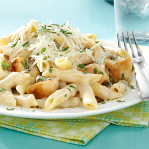 1. Cook pasta according to package directions. Meanwhile, in a large skillet over medium heat, brown chicken in oil on all sides. Add garlic; cook 1 minute longer. Add wine, stirring to loosen browned bits from pan.