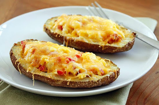 Pierce potato with a fork a few times all around. Place in microwave and cook about 5 minutes per potato. When finished, allow to cool enough to handle. Cut potatoes in half horizontally. Scoop out potatoes leaving about 1/4 inch thick wall. (Skins weigh 2.5 oz after scooped)
