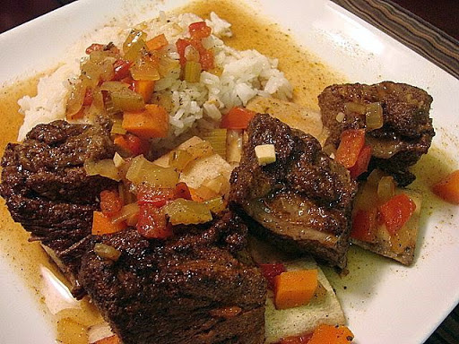 Short ribs and diced vegetables braised in a spicy, savory sauce