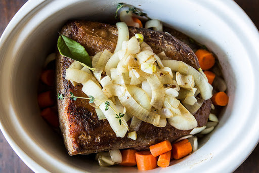 Mix together the salt, garlic, Italian seasoning, black pepper, oregano, basil, and red pepper flakes on a large plate. Rub roast with 1/2 cup vegetable oil. Roll roast in seasoning mixture until well coated. Place the roast in the crock pot along with any left over seasoning mixture and oil.