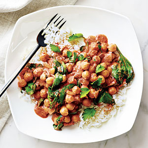 While rice cooks, heat a Dutch oven over medium-high heat. Add oil to pan; swirl to coat. Add onion; sauté 5 minutes or until tender, stirring frequently. Stir in garam masala; cook 30 seconds, stirring constantly. Add chickpeas, tomatoes, and spinach; cook 2 minutes or until spinach wilts, stirring occasionally. Remove from heat; stir in yogurt and salt. Sprinkle with cilantro. Serve over rice.