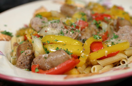 Meanwhile, boil the pasta until al dente. Drain and place on a large platter. Top with the sausage and peppers. Grate parmesan over and serve.