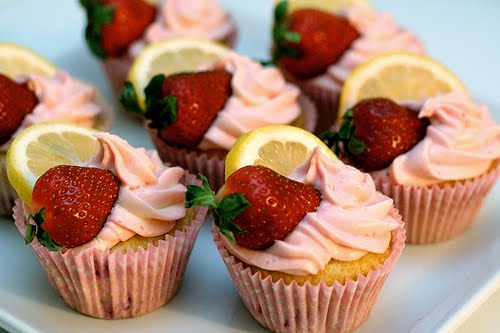 To make the frosting, puree the strawberries in a food processor or blender. Strain the puree through a mesh sieve to remove the seeds, and set aside. Beat the cream cheese and butter in the bowl of an electric mixer on medium speed until smooth and very fluffy, about 5 minutes. Add the powdered sugar and mix until smooth. Add the lemon juice and vanilla extract and mix until incorporated. Mix in strawberry puree, a tablespoon at a time, until you achieve your desired texture and flavor of frosting (I added about 7 tablespoons of puree). Frost cupcakes as desired and garnish with fresh strawberries and lemon slices.