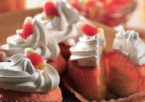 before serving, top each cupcake with a dollop of whipped topping and a piece of candy corn. Refrigerate or freeze leftovers.