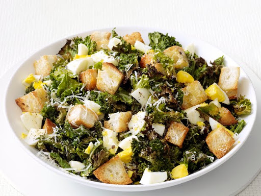 Puree 1/3 cup olive oil, 1 garlic clove, 2 anchovy fillets, 1 teaspoon Worcestershire sauce, and salt and pepper to taste in a blender. Toss 1 1/2 cups crusty bread cubes with 1 tablespoon of the dressing; broil on a baking sheet until toasted, about 2 minutes. Toss 1 1/4 pounds chopped kale with the remaining dressing; broil on another baking sheet, stirring, until crisp, 5 to 8 minutes. Put the kale and croutons in a bowl and top with lemon juice, grated parmesan and a chopped hard-boiled egg.