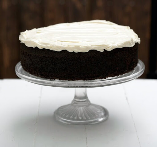 For the frosting, beat the powdered sugar and cream cheese together until well combined and creamy. Add the cream and beat again until it's a spreadable consistency. I found slowly adding the cream and beating the icing very well gave excellent results. At first there seems like a lot of frosting for just the top of a 9-inch cake but don't skimp! The idea is to frost the top of the cake until it resembles the frothy head of a pint of Guinness. It's quite dramatic and lovely.