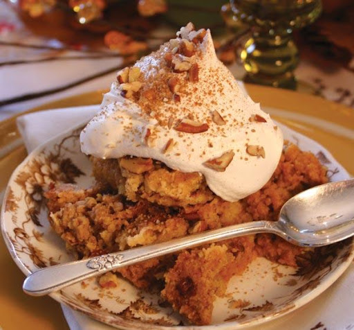 Bake at 350 degrees for 45 minutes to one hour, until a toothpick tests clean. Serve with whipped topping sprinkled with nuts and cinnamon or nutmeg, if desired.