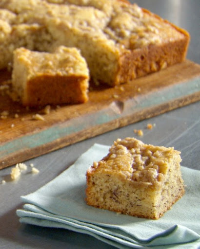To make the topping, squeeze the flour, brown sugar, and butter together with your hands. Crumble the topping evenly over the batter. Bake for 35 to 40 minutes. When the cake is done, an inserted toothpick or fork should come out clean from the center.
