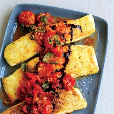 While tomatoes cook mix panko, cheese and black pepper. Add fish to egg then panko. Heat a thin layer of EVOO in a large skillet over medium heat. Add fish and cook turning once until crisp and brown all over...8 - 10 minutes total.
