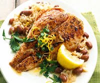 4. Serve fish with rice and beans. Drizzle melted butter over top; sprinkle lemon peel and parsley. Pass lemon wedges. Makes 4 servings.