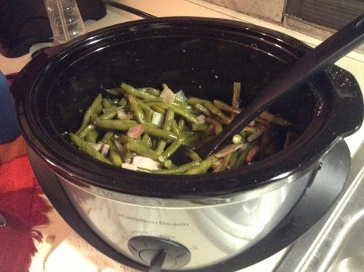 PLACE GREEN BEANS, CARROTS POTATOES ONIONS, SUGAR SALT PEPPER AND CRUMBLED BACON AND WATER TO CROCK POT