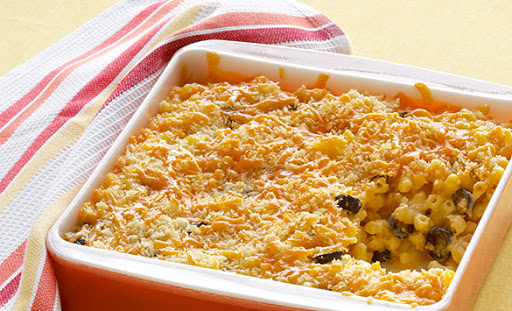 Remove from heat; stir in 1-1/2 cups of the cheese until melted. Stir in drained pasta and olives; mix well. Transfer to an 8 or 9-inch glass baking dish coated with cooking spray. Bake 15 minutes. Combine remaining 1/2 cup cheese and bread crumbs; sprinkle over pasta mixture. Bake 8 to 10 minutes or until bubbly.