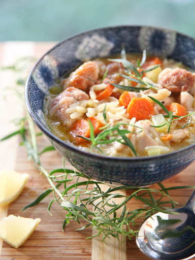 Add the remaining 1 tablespoon of oil and the carrots, celery and onion to the stockpot and cook over medium heat for 3 minutes. Add the sliced leek and garlic and cook for about 2 minutes and season with salt and pepper. Add the chicken stock and water and bring to a boil. Cover and simmer over low heat, stirring occasionally for about 20 minutes.