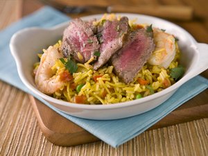 In a large bowl, drizzle the chicken, flank steak, and shrimp with olive oil and season on all sides with salt and pepper, to taste. Grill the chicken until cooked through, about 6 to 8 minutes per side. Grill the flank steak to desired doneness, about 5 minutes per side for medium. Transfer the chicken and steak to a cutting board and let the meat rest for 5 minutes before slicing. Grill the shrimp until just cooked through, about 3 minutes per side. Grill the scallions until brown, about 2 to 3 minutes per side.