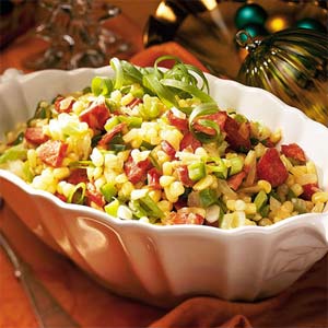 Sauté onion and bell pepper in hot oil in a large skillet over medium heat 8 minutes or until tender. Add corn, tomato, and sausage; cook, stirring often, 15 minutes. Stir in green onions, salt, and pepper; cook 5 minutes.