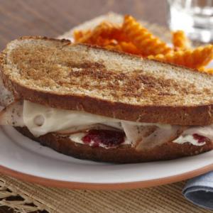 Heat griddle or large skillet over medium high heat. Grill sandwich with buttered sides out for 2 to 3 minutes or until lightly browned. Flip sandwich and cook an additional 2 to 3 minutes until sandwich is browned and cheese has melted.