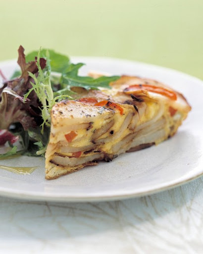 This dish is based on tortilla Espanola. In Spain, it is traditionally accompanied by garlic mayonnaise but it is also delicious served on its own. You can use leftover boiled or baked potatoes in place of the raw ones. Simply slice them, and add to the onion mixture at the end of step 2.