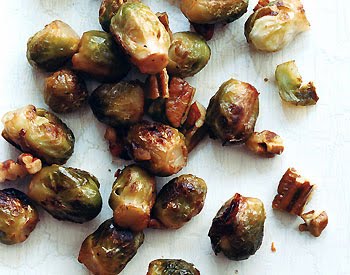 Melt remaining 2 1/2 Tbs. butter in a 12-inch heavy skillet over moderate heat, then add garlic and cook, stirring, until fragrant, about 1 minute. Increase heat to moderately high, then add sprouts and saute, stirring occasionally, unti browned in patches, about 5 minutes. Add lemon juice, pepper, and remaining 1/2 tsp. salt, then stir in pecans and serve.