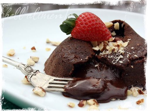 6. WHILE cakes are cooking, chop your walnuts & cut your strawberries. When cakes are ready CAREFULLY remove them from oven, place a plate on top of each one and quickly invert it. With a kitchen towel remove the ramekin, cake should fall right out. Garnish with nuts & strawberries. Serve immediately!