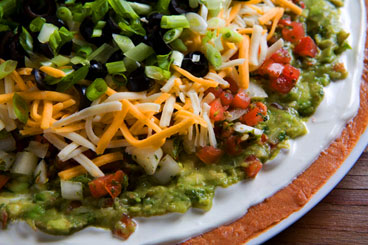 Top the layers with salsa. Place a layer of tomato, green bell pepper, green onions and lettuce over the salsa, and top with Cheddar cheese. Garnish with black olives.