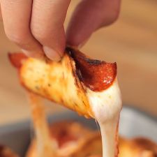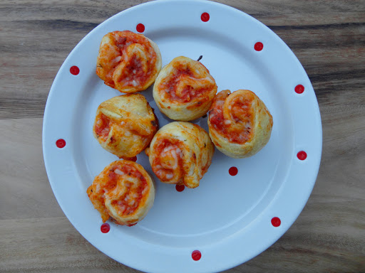Pizza sauce and mozzarella cheese rolled into crescent roll dough to make tasty bite-sized pizza rolls.