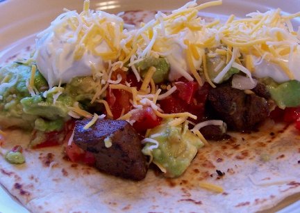 (6) To serve, double up the tortillas and place a few spoonfuls of the pork carnitas on them. Top with guacamole, salsa, sour cream and/or grated cheese (use whatever condiments you prefer).