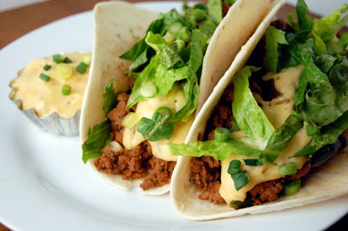 7. Add the meat mixture to each taco, drizzle with cheese sauce, top with green onion and lettuce, then serve.